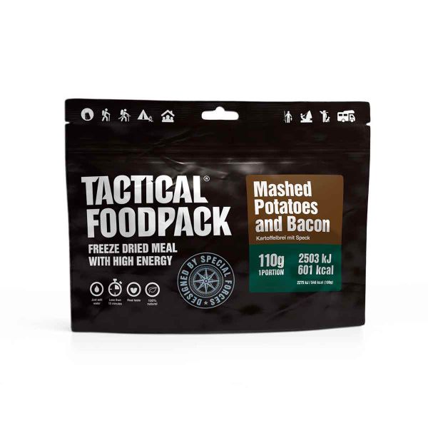 Dieses Kartoffelpüree mit Speckwürfeln lässt sich einfach zubereiten und wird je nach Situation mit heißem oder kaltem Wasser rehydriert. Das horizontale Beutelformat ermöglicht es Ihnen, mit Ihrem Spork bequem die letzten Bissen zu erreichen – deutlich einfacher als bei einem vertikalen Beutel mit höheren Rändern.